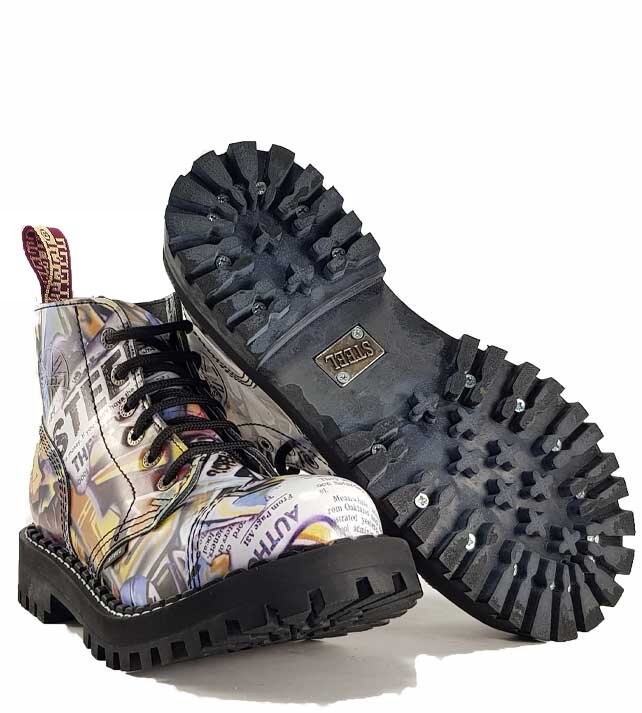 Steel Boots 6 eyelets, Graffiti, leather vamp, hardened rubber sole, triple stitch, steel toe, fleece insole, The shoe height is 6,57 inches, the sole height at the heel is 1,46 inches, the sole height at the toe is 0,95 inches