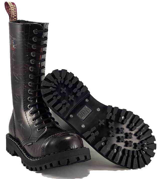 Steel Boots 15 eyelets, Burgundy Rub Off, leather vamp, hardened rubber sole, triple stitch, steel toe, fleece insole, The shoe height is 12,21 inches, the sole height at the heel is 1,46 inches, the sole height at the toe is 0,95 inches