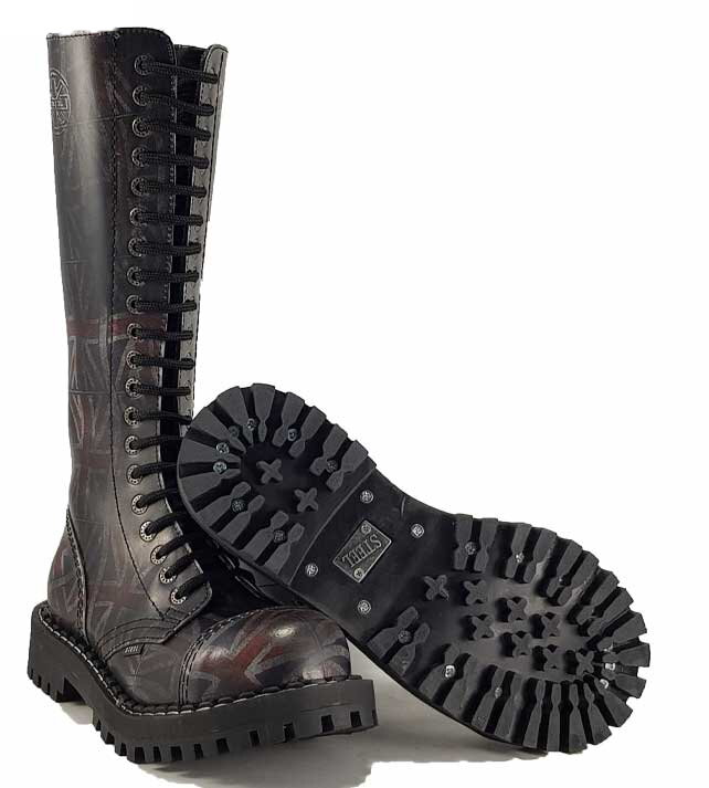 Steel Boots 20 eyelets, UK Flag Rub Off, leather vamp, hardened rubber sole, triple stitch, steel toe, fleece insole, The shoe height is 15,35 inches, the sole height at the heel is 1,46 inches, the sole height at the toe is 0,95 inches
