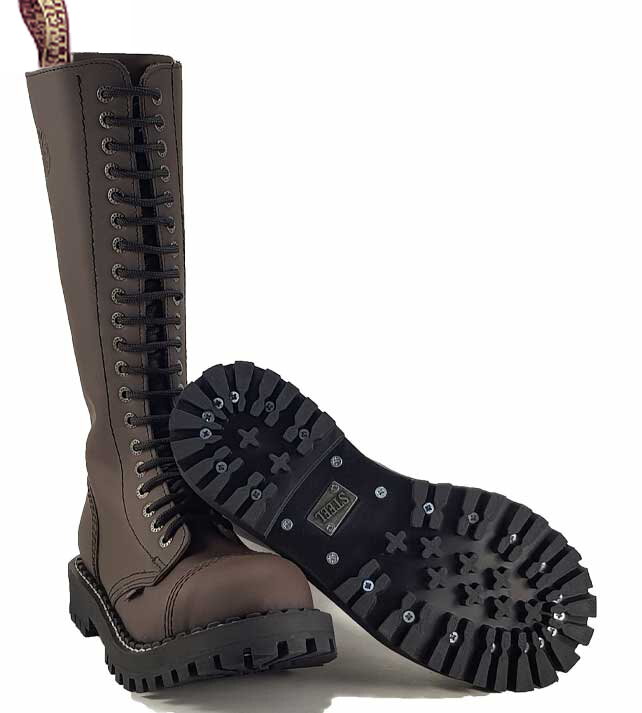 Steel Boots 20 eyelets, Brown, leather vamp, hardened rubber sole, triple stitch, steel toe, fleece insole, The shoe height is 15,35 inches, the sole height at the heel is 1,46 inches, the sole height at the toe is 0,95 inches